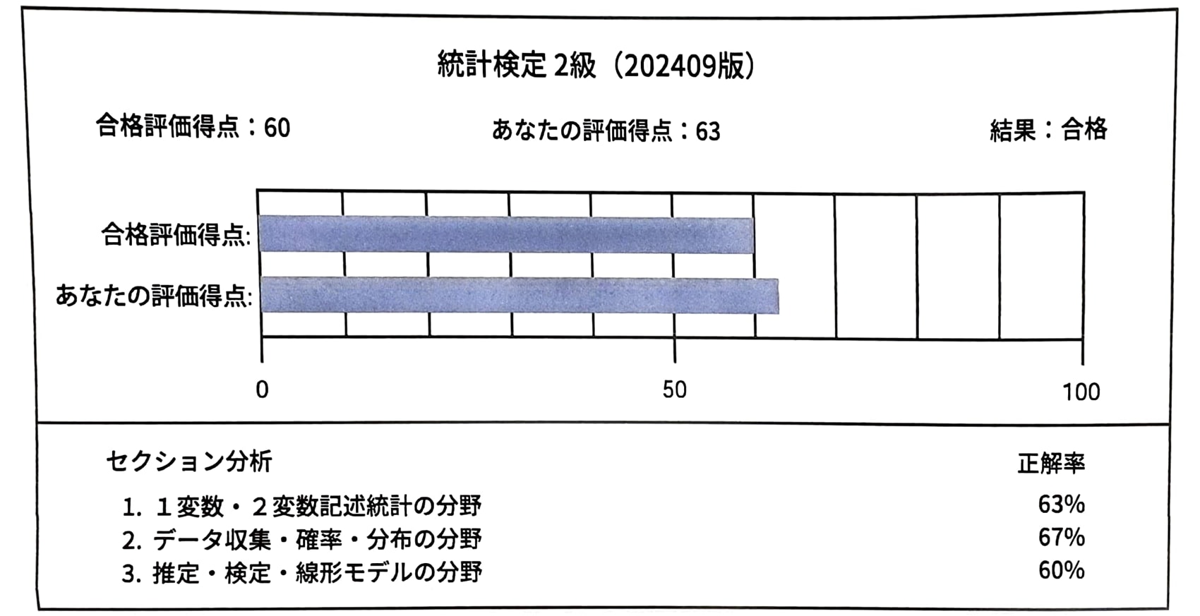 まだ統計に関してあやふやなところも多く、合格したといっても63点はあまりにギリギリすぎる。